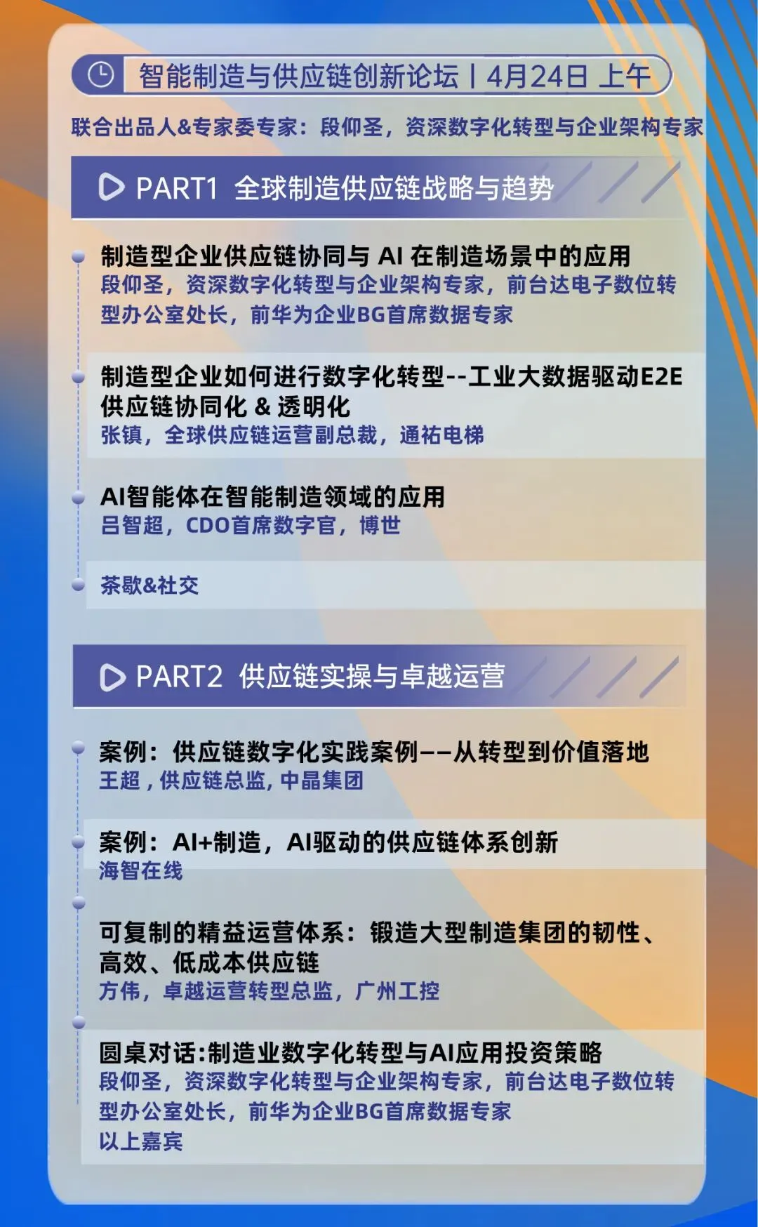 4 月 24 日,智能制造与供应链创新论坛将聚焦全球制造战略、数字化转型与 AI 智能体应用,由前华为企业BG首席数据专家段仰圣、博世电动工具首席数据官吕智超、通祐电梯全球供应链运营副总裁张镇、中晶集团供应链总监王超、广州工控集团卓越运营转型总监方伟等行业专家,解读制造协同、工业大数据、AI 智能体应用,拆解多行业转型案例,共议数字化与 AI 投资策略,为企业智能制造转型与升级提供前沿思路与落地方案。