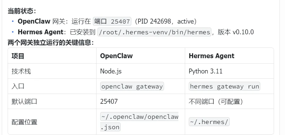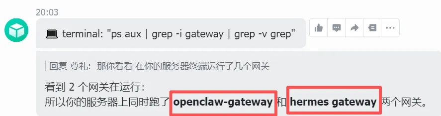 直接上图,openclaw和Hermes在一个服务器上同时跑了起来!!