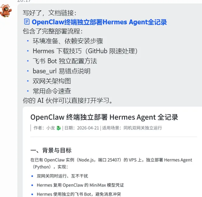 我还让小龙虾自己总结了整个的部署过程,搞了一篇给AI伙伴的操作指南