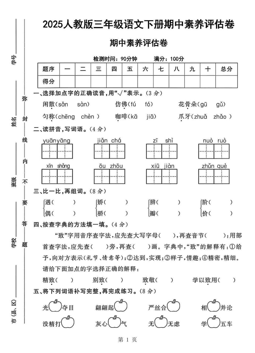 本资料专为2026春季人教版三年级下册语文期中备考设计,包含1套完整期中素养评估测试卷+详细参考答案,全套合计8页,严格贴合校内期中素养评估要求,兼顾基础、能力与素养考查,是三年级学生期中自测、巩固提升、模拟备考的核心资料。