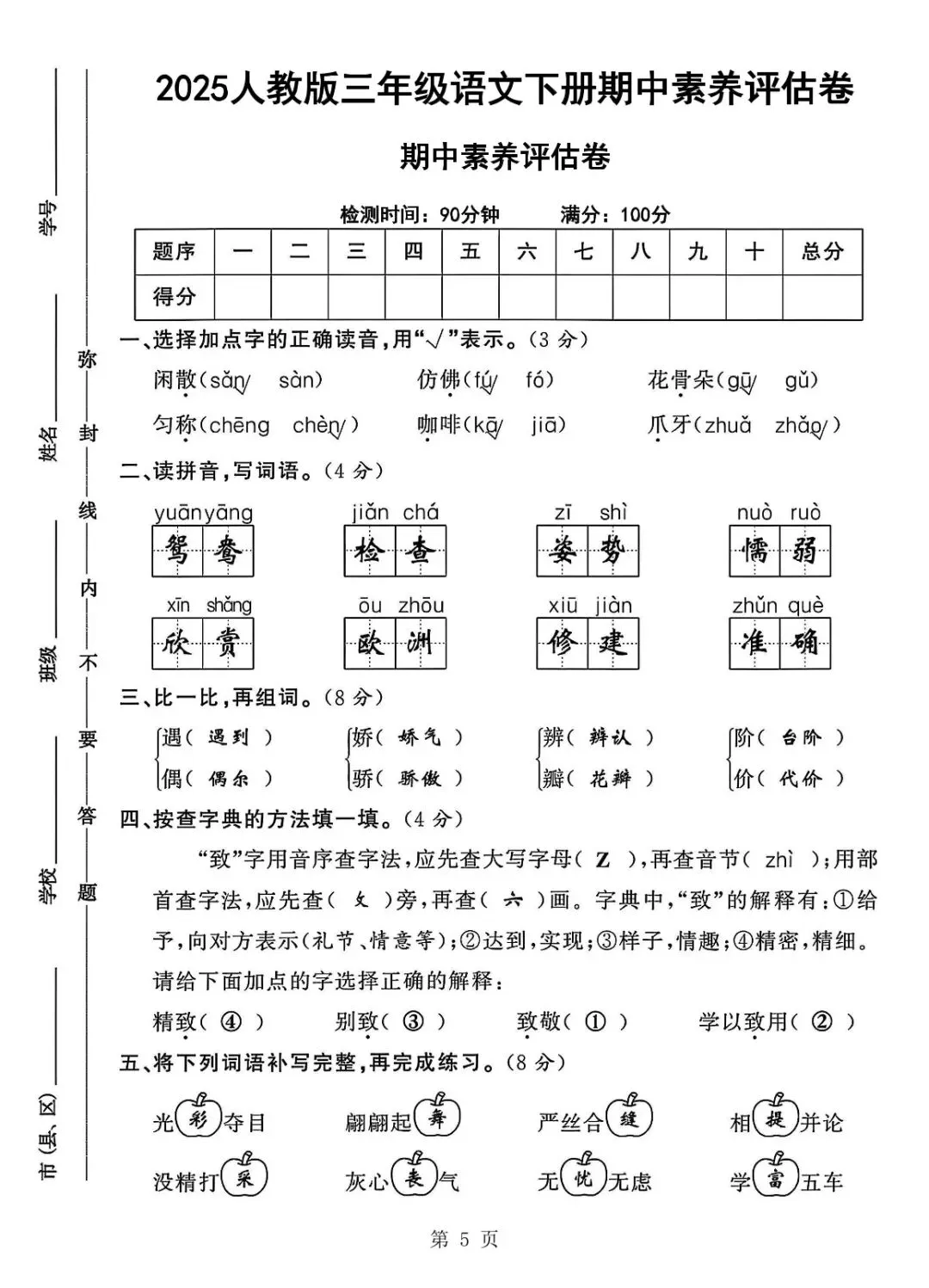 可下载丨三年级下册语文期中素养评估测试卷(5套试卷),电子版