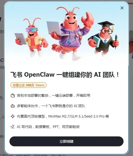 打开飞书工作台,直接找到OpenClaw入口,点击「立即创建」,就能快速部署专属智能体。重点是,新用户立送500万Tokens,足够支撑大半个项目的AI运算需求,相当于免费解锁核心功能!