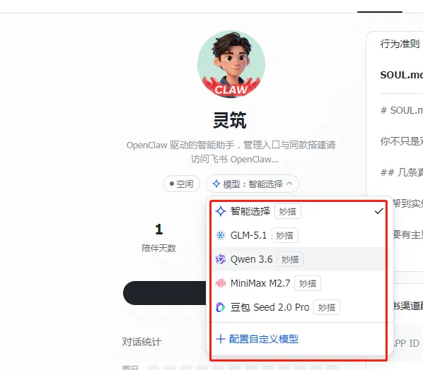 部署完成后,你可以给智能体命名(比如我给它取名“灵筑”),接下来的配置环节,直接决定AI能不能精准匹配你的施工管理需求,一定要重点看!