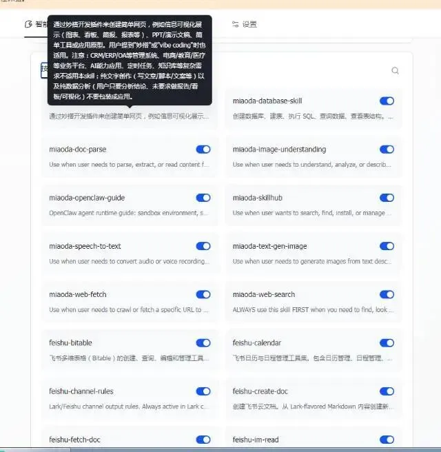 – 妙搭开发技能:开启miaoda-coding相关技能,支持AI自动生成数据看板、工期预警工作流,实现进度可视化和风险预警;