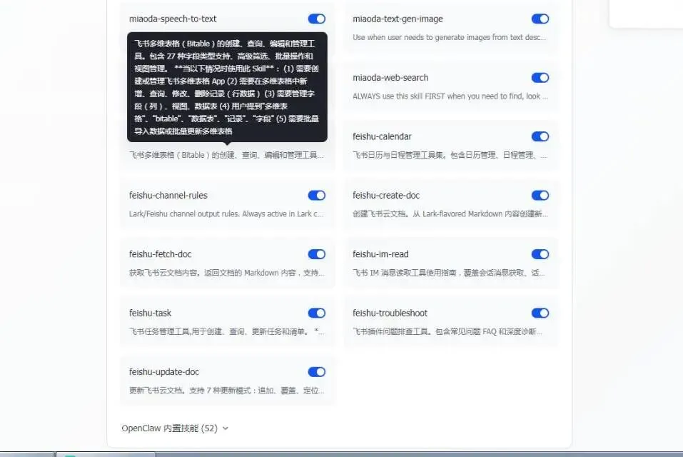 – 多维表格(BitTable)技能:开启feishu-bitable,这是AI生成施工甘特图、进度表的核心,能让AI直接创建、编辑、查询施工进度多维表;