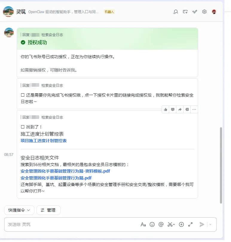 AI会自动关联飞书知识库,从企业内部资料中精准匹配相关文档,直接发送给你,还会提取核心要点,帮你节省找资料的时间,专注现场管理。