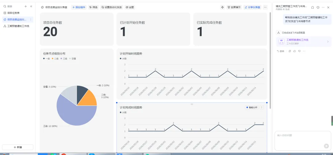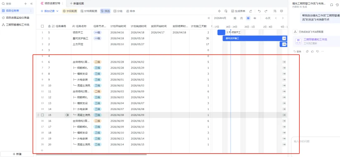 – 进度自动更新:现场人员在多维表中更新实际开始/结束时间,AI会自动同步数据,对比计划工期,实时计算进度偏差,不用手动统计;