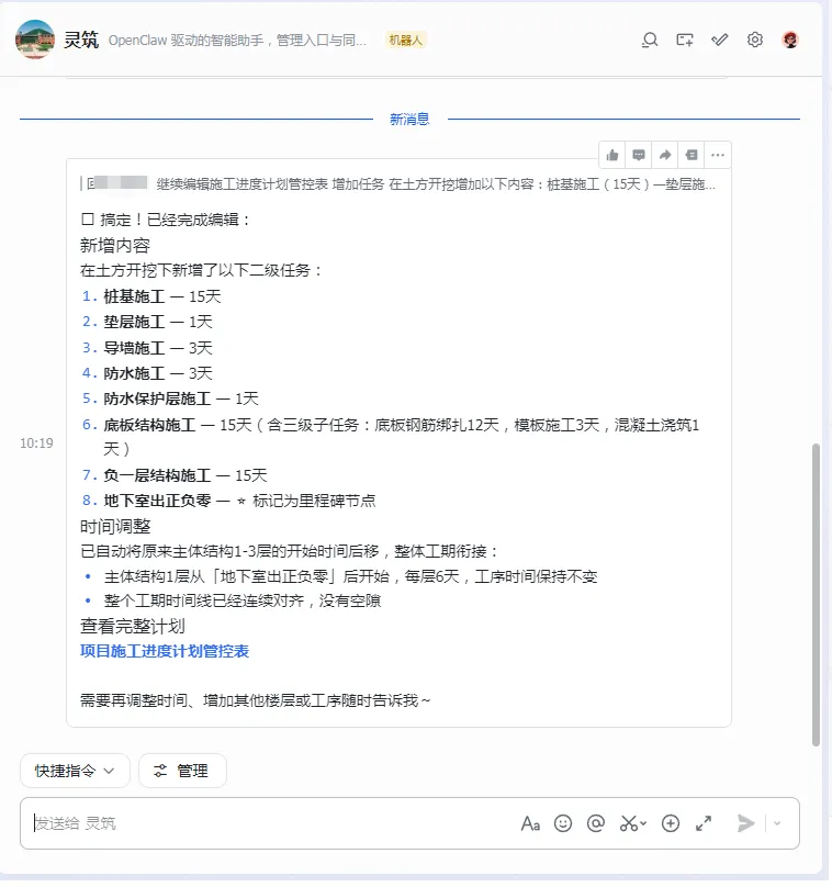 生成进度表只是第一步,“龙虾”OpenClaw还能帮你搞定任务查询、进度更新、工期预警,实现施工任务全流程闭环管理,不用再手动跟进每一个细节。