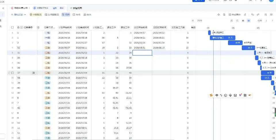 – 字段自动配齐:任务编号、节点级别、施工天数、实际进度、紧前紧后工作等核心字段全部到位,不用手动设置列名、调整格式。