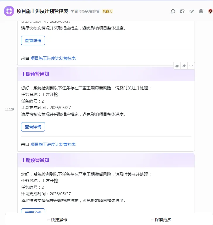 – 工期自动预警:提前设置进度滞后阈值,当任务进度滞后超过阈值,AI会自动触发飞书消息通知,给项目负责人发送预警,把小问题及时解决,避免拖成大风险。