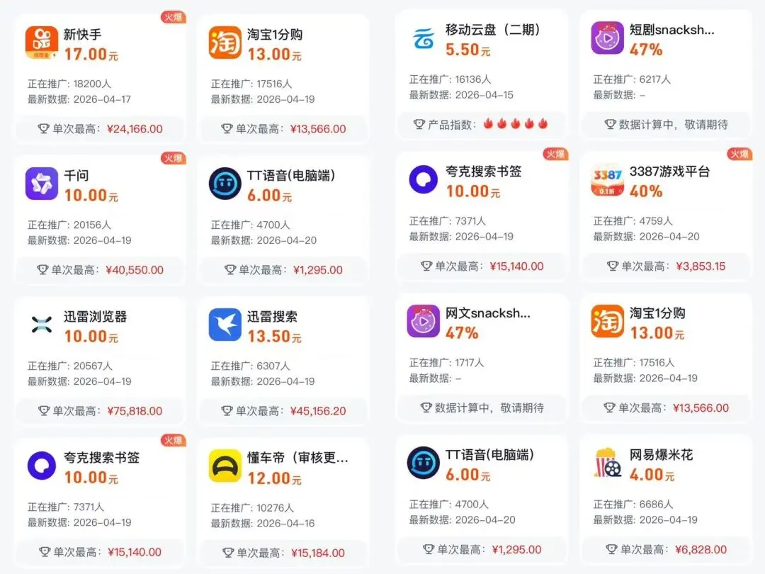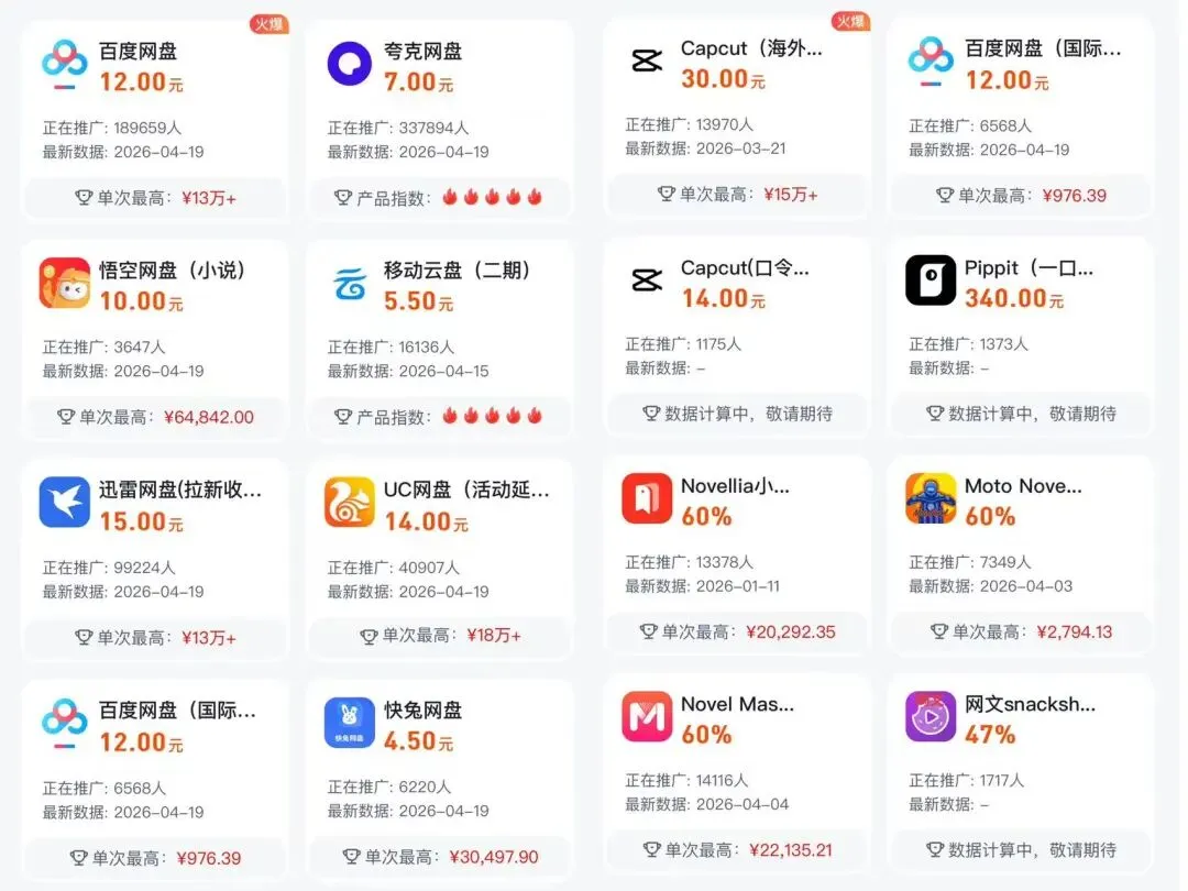 每天一个网创项目-APP推广 项目逻辑:从集成平台上绑定链接,帮指定APP拉新或激活老用户,获取报酬以及分成 像很火的网盘拉新,底层逻辑均基于此! 部分APP的报酬截图:价格/人次 同时平台内,也会提供一些基础的教学课程供你去学习! 假如你是做私域,电商虚拟资料等行业的,完全可以顺手去平台申请绑定一下网盘的推广链接,这样你在淘宝,闲鱼售卖虚拟资料的时候,就多了一份收入! 今天的分享就到这里啦! 在推文里,我就不放平台的下载地址了,添加我好友,找我拿地址就行!