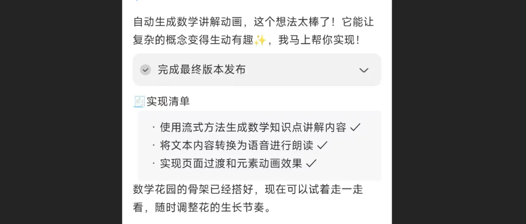 因为最近教孩子数学差点搞得父子感情破裂,我就想着能帮我搞一个用动画讲解数学的APP,既能教孩子数学也能维持父慈子孝。于是我用世界上最伟大的语言——中文,直白的告诉了我想要做啥东西。