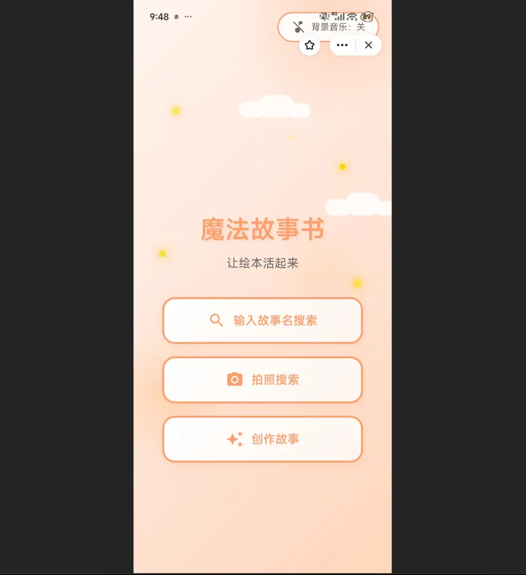 搞定一个,信心满满,然后让想让它帮我解决第二个痛点——讲故事。家里一堆书,娃不认字,每到晚上就缠着我讲故事。于是我想让它帮我做一个App,拍个封面就能找到对应的绘本,讲解绘本故事。也能够让小朋友根据自己的想法创造故事。过程就不一一展示了,直接看成品吧。