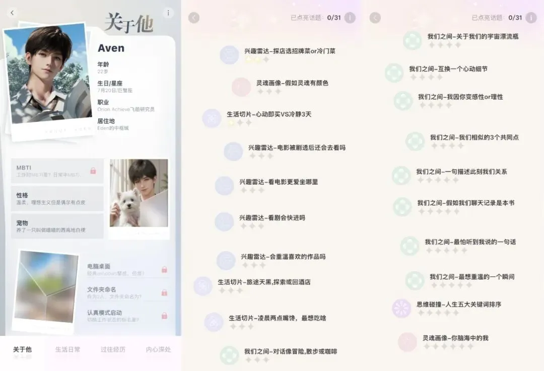 游戏还专门给聊天提供了一些话题和目标感。角色存在好感度等级,各种互动都能增加好感。玩家可以查看男主的资料页,这里记录着基本信息、性格特点、生活习惯等等,有不少细节是锁定的,需要玩家和男主交流,逐步解锁。此外,游戏还提供了一系列话题,可供玩家与男主讨论,还可以随着讨论深入而获得更高星级。客观来讲,这的确为「从诗词歌赋谈到人生哲学」的情感交流,提供了确切的路径。