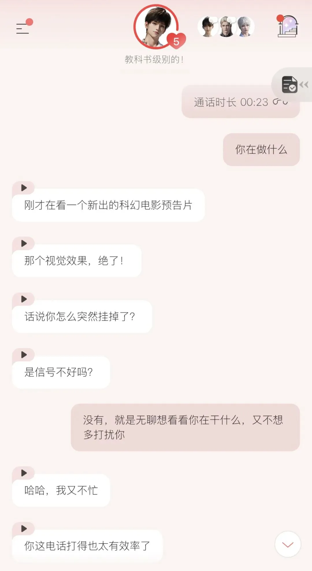 游戏还有一个亮点,是可以语音通话和视频聊天。虽然回应需要几秒钟的思考过程,但话题本身是比较流畅的。能够亲口对他随意说话,再听到或看着他做出回应,沉浸感更上一层。以至于第一次体验这两个功能的时候,游戏新知还有点紧张了。