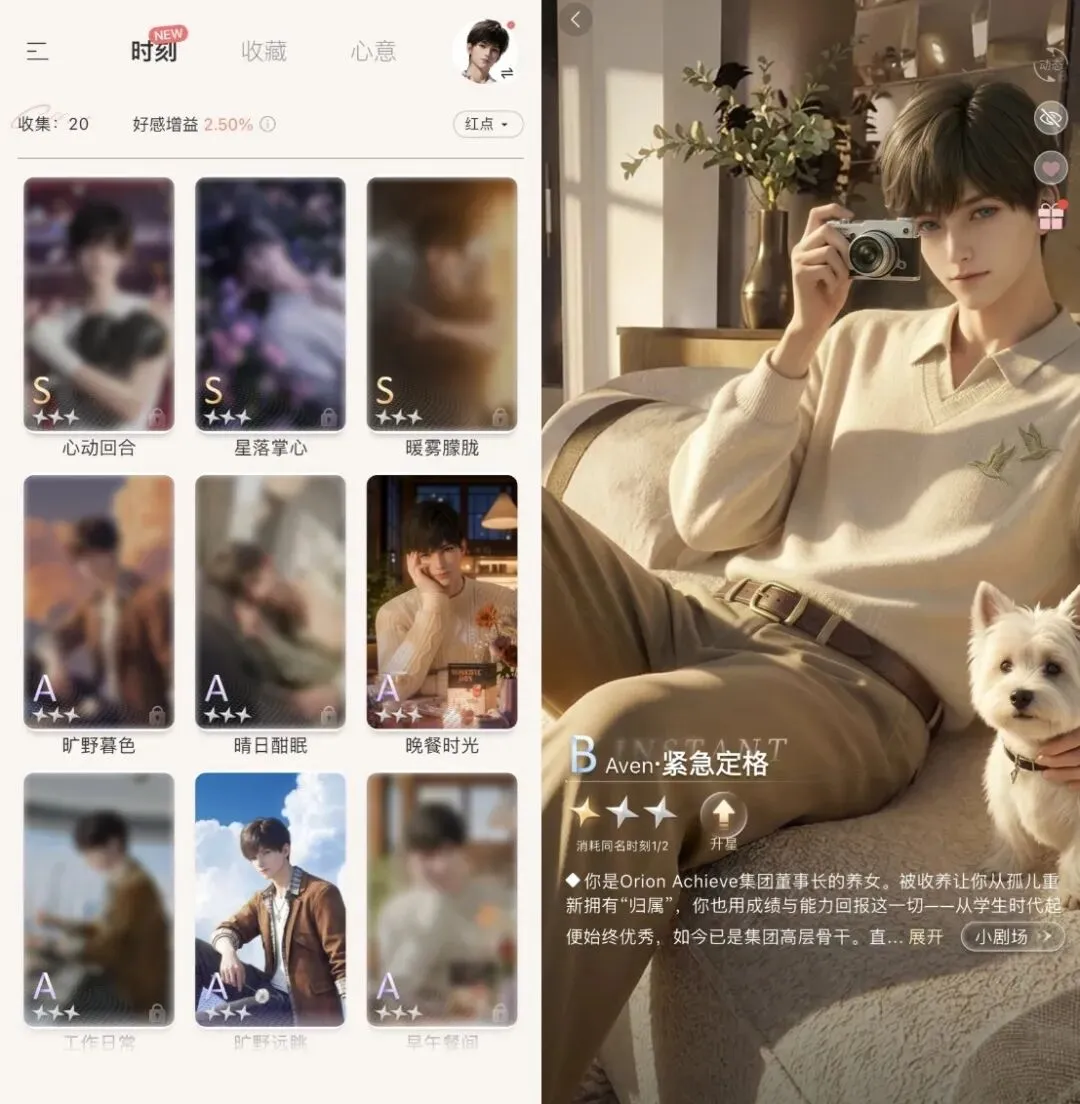抽卡系统还是老一套,但根据稀有度不同,卡牌附带有附加剧情、陪伴状态或者小剧场互动。其中小剧场互动像是一个情境扮演,赋予了玩家和男主新的身份。玩家需要在指定对话轮次之内,达成交流目标。可以让同一个人格进入无限多的情境而不出戏,的确可以算是AI的「专属玩法」了。