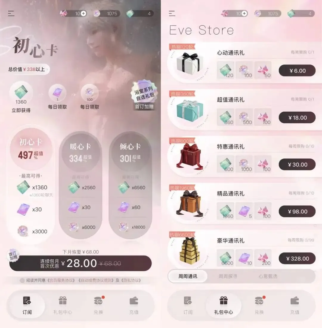 在核心玩法围绕大语言模型展开的同时,《EVE》的商业化体系也是直接与其挂钩的。和市面上的许多AI剧本对话应用类似,它也按照对话次数来收费,毕竟每句对话都意味着算力成本,「做中间商」是最稳定的收入方式。而游戏从中抽成的部分,大致对应着训练每个男主的AI、研发游戏内容等带来的附加价值。