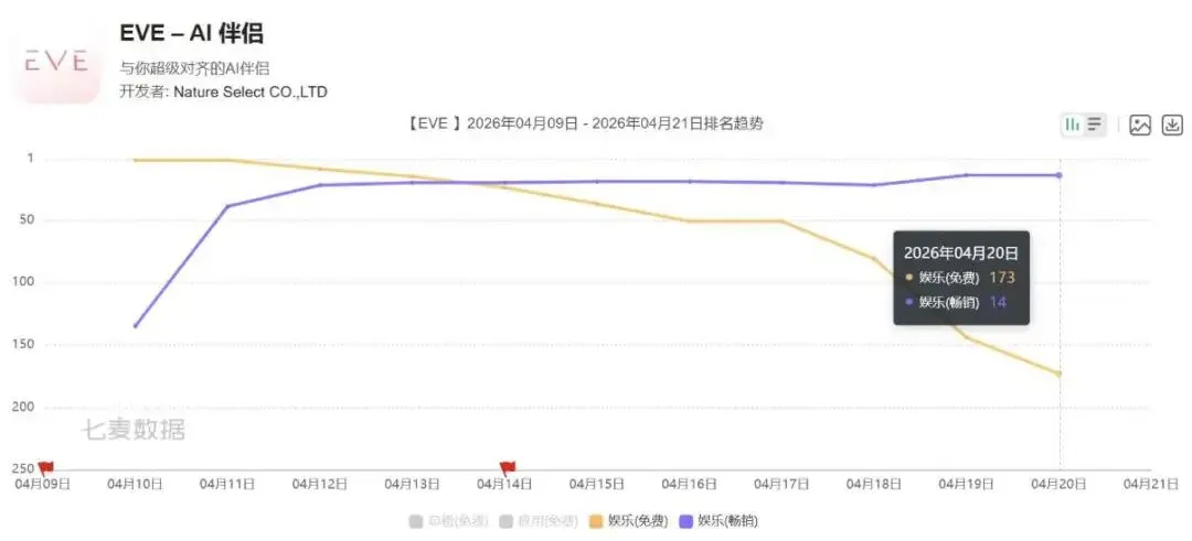 从目前的iOS双榜排名来看,《EVE》的势头倒还算比较积极,可能是「第一款产品」的红利依然可观。它没有被算在游戏品类里,而是算在应用-娱乐细分品类里,目前在娱乐畅销榜已经上升到了第14名,在同类产品中仅次于《猫箱》。从Sensor Tower的收入预估来横向对比,这大约相当于游戏畅销榜的第66~67名(按4月19日计算)。