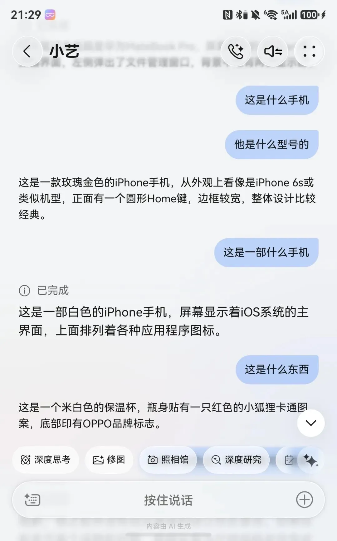 我还增加了难度,拿出一款旧手机让它猜是什么型号,华为AI眼镜精准描述了手机的外观设计,还注意到了手机底部的Home键和屏幕内的应用图标,从而推断具体的型号。