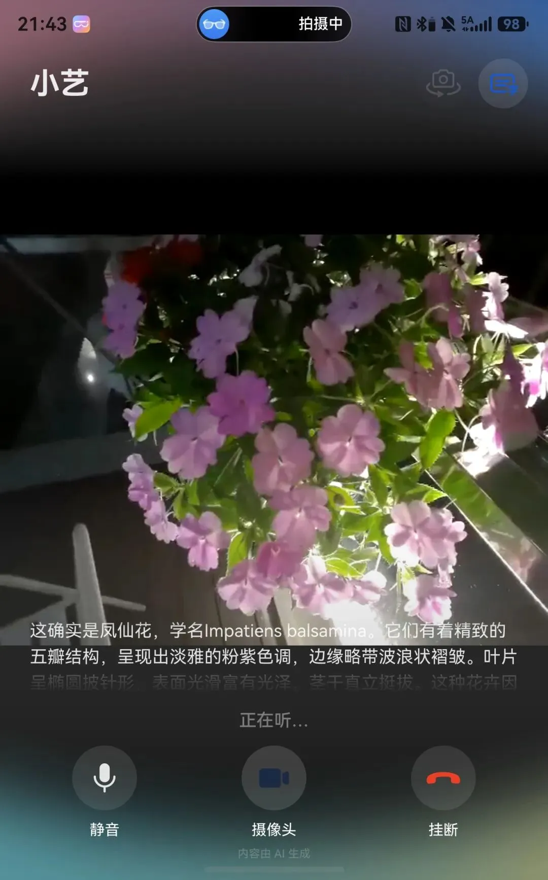 相比AI对话,我们更感兴趣的还是AI视频实时互动功能。开启它很简单,华为AI眼镜连接手机的情况下,长按一下镜腿上的AI键就行了。这个功能启动后,手机界面上会出现一个实时的视频浮窗,看起来就像是视频通话时的界面,以让我们知晓当下摄像头所拍摄的画面。