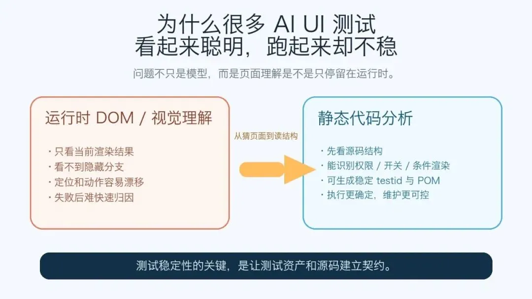 图 1:很多 AI UI 测试不稳,不是因为它不会看页面,而是因为它只能看页面。