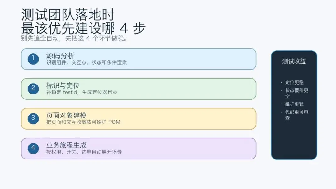 先识别组件,再补稳定 testid,再生成定位器目录。