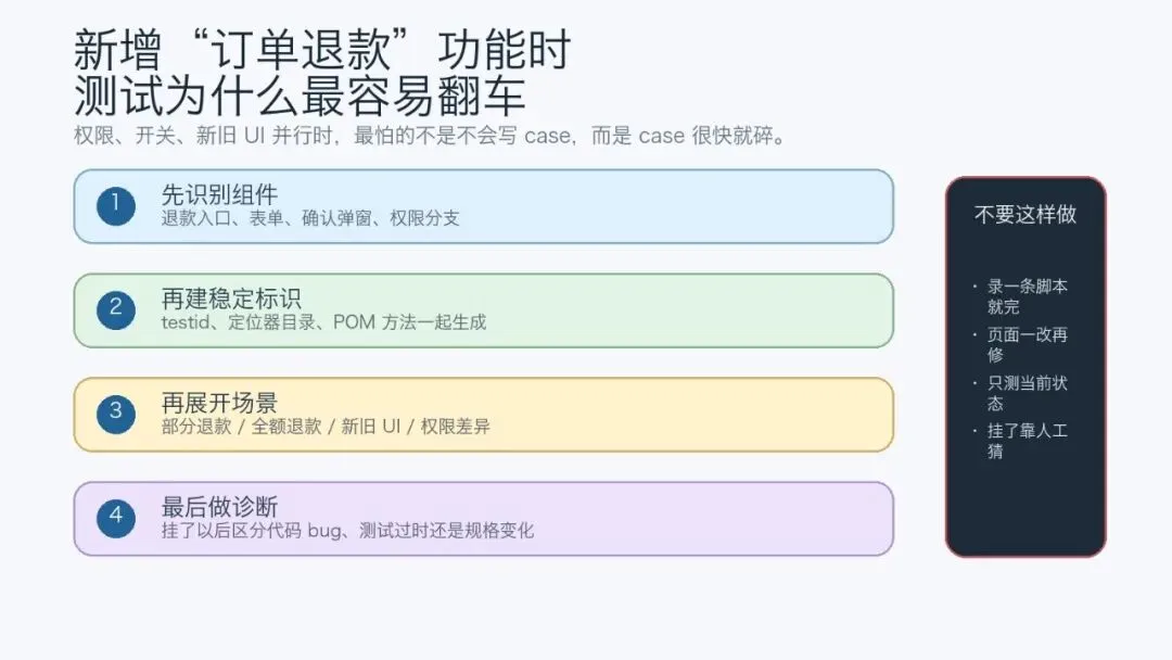 图 4:退款这类多权限、多开关、多流程场景,最能体现静态代码分析比 DOM 盲抓更适合长期回归。