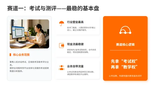三大赛道合起来,就是考试引流、课堂铺量、作业锁客、数据变现。形成可复制、可扩张、可持续的对公闭环。