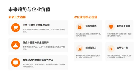 过去几年,教培大起大落,C端流量越来越贵,而只有To G/To B公立教育市场,政策持续加码、预算长期稳定、需求刚性存在。