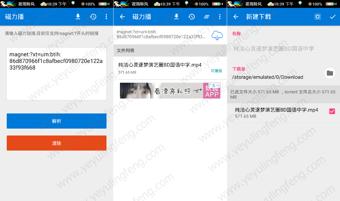 一般磁力链接都是以magnet:?xt=开头,至于以torrent为后缀名结尾的就是大家熟知的种子了,如果还是看不明白的说明你还是个好孩子。复制magnet:?xt=开头的字符串后我们就打开今天介绍的这款软件,进入首页直接将刚刚复制的玩意粘贴至相关位置点击解析即可~