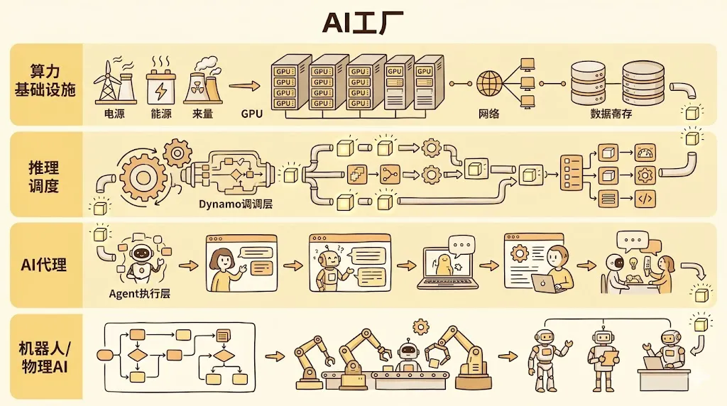 它们正在拼成一条完整链路:从 Token 到智能体,从智能体到工作流,从工作流到机器人,从机器人再回到新的工业能力。