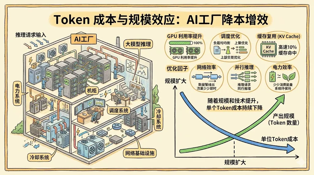 黄仁勋把 AI 工厂和发电厂、制造工厂类比,本质上是在强调一件事:一旦 Token 成为真正可计量、可优化、可规模化生产的产物,边际成本就会像工业时代的电力和算力一样不断下降。