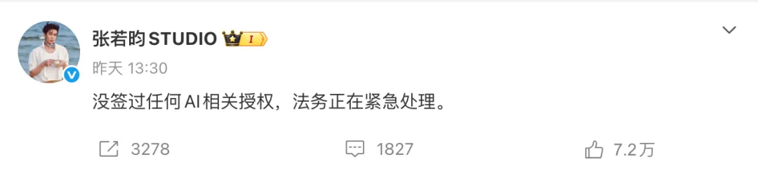 张若昀工作室率先发声:“没签过任何AI相关授权,法务正在紧急处理”。随后,于和伟、李一桐、王楚然等艺人的团队接连否认签署过任何AI授权。