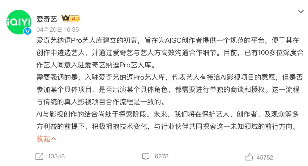 2026年4月20日,爱奇艺在其年度“世界大会”上高调宣布推出专业级影视制作平台“纳逗Pro”,并建立“AI艺人库”,声称已有超过100位深度合作艺人同意入驻。