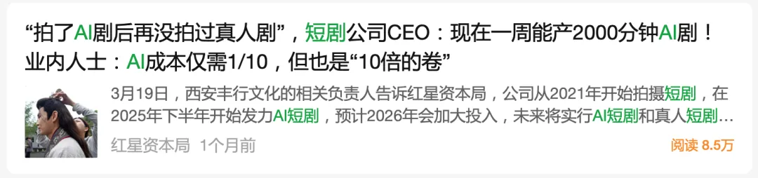 这也是为什么在AI技术仍存在表情僵硬、肢体不自然等诸多瑕疵的情况下,AI短剧依然能够以惊人的速度扩张。