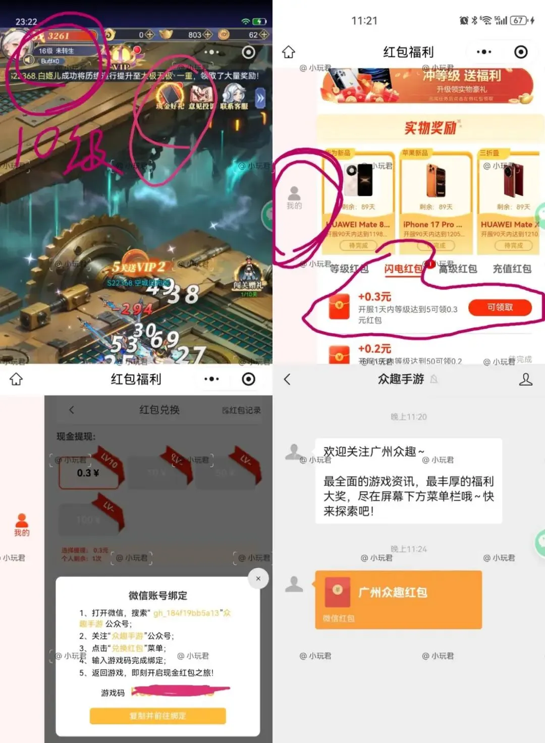 需要先关注公众号“众趣手游”,点击底部菜单,绑定游戏码,再返回游戏中提现,提现秒推红包。