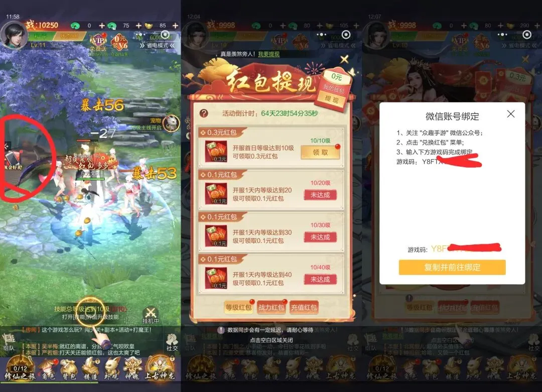 按指引升级到10级以上,左边“现金好礼”,选择等级红包,领取0.3元红包,按提示给出的游戏码,去公众号“众趣手游”绑定,绑定好后返回游戏提现即可。如果没有提现名额,可以在进入游戏时换服领取。