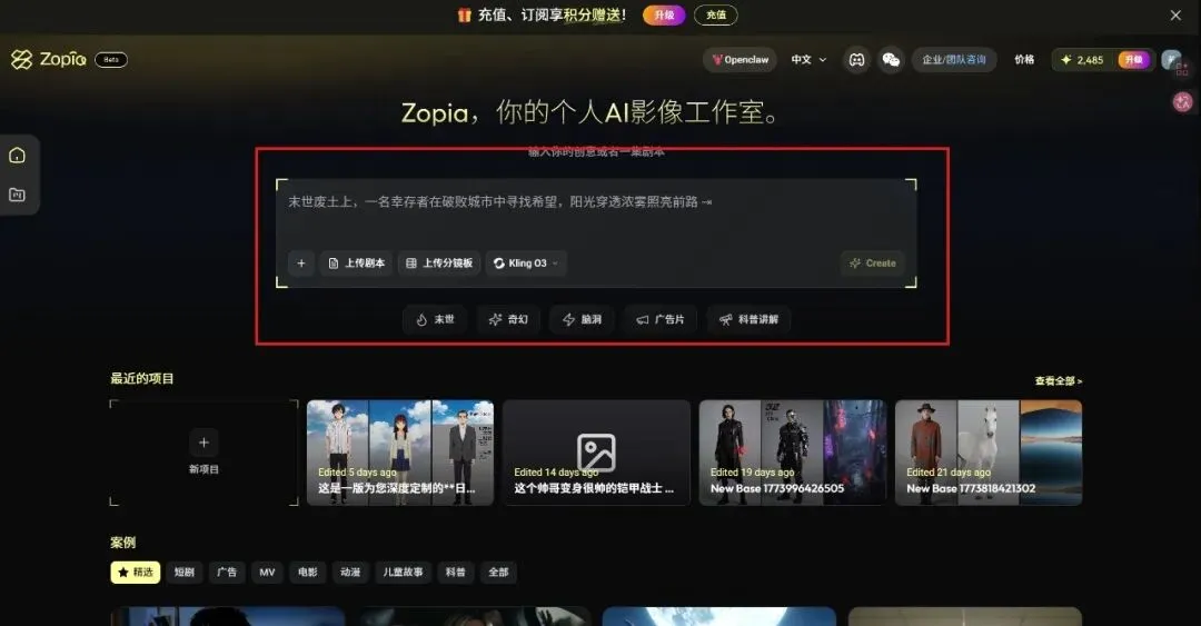 你只需要输入简单的想法,或者上传你自己的脚本,点击create,你的想法就会自动进入Zopia的全流程AI影像生产流水线。