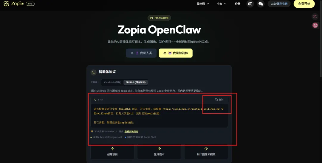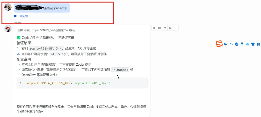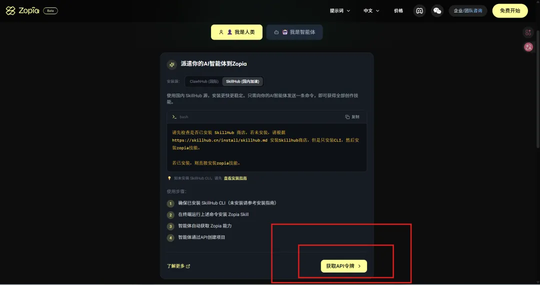 - 第四步:回到zopia龙虾界面,点击我是人类,获取zopia的专属API秘钥,再回到(飞书)龙虾的聊天对话框交给龙虾就好啦!