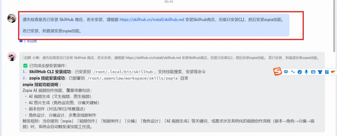 - 第三部:回到打通了 OpenClaw 的通讯软件,飞书、微信都可以,然后让龙虾自主安装skill
