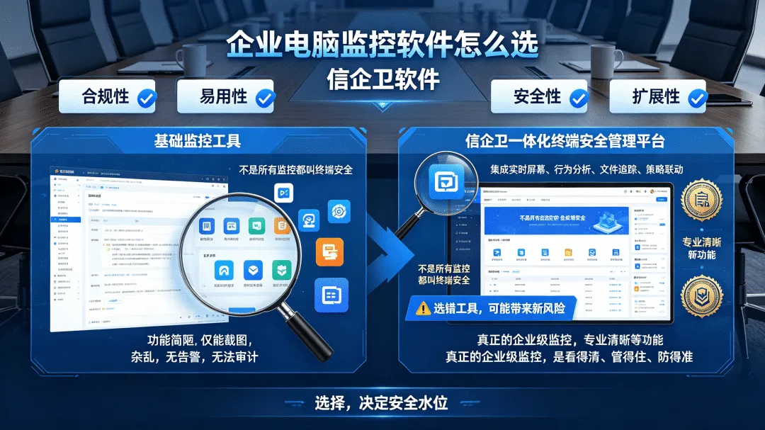 企业终端安全防线,从来不是简单的监控员工,而是守住核心资产、提升办公效率的双重保障。选电脑监控软件,核心是匹配企业自身需求,防泄密优先选金锁恒安,效率与安全兼顾选信企卫软件,分布式团队管理选穹网智锚。部署前做好小范围测试,平衡管控力度与员工接受度,才能让终端安全管理真正落地生效,为企业数字化发展筑牢安全根基。