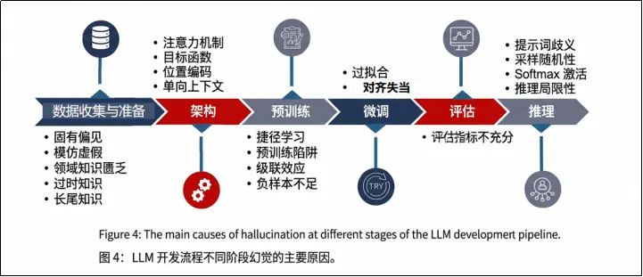 我们在上一篇推文说大白话:什么是“AI 幻觉”?中提到过AI幻觉的“底层病理(引擎机制):幻觉根源于概率计算。模型是基于概率预测,其本质是最大化“统计合理性”,而非“逻辑真实性”。这是根因。通过查找资料,我发现在工程实现上,AI幻觉的产生还有各种诱因。感兴趣的读者可以查看这篇论文《A Comprehensive Survey of Hallucination in Large Language Models: Causes, Detection, and Mitigation》,这篇论文将LLM开发流程分为六个不同阶段:数据收集与准备、模型架构、预训练、微调、评估和推理,每个阶段的工程实现都有可能导致幻觉的产生,这些因素是诱发AI幻觉的“工程变量”。