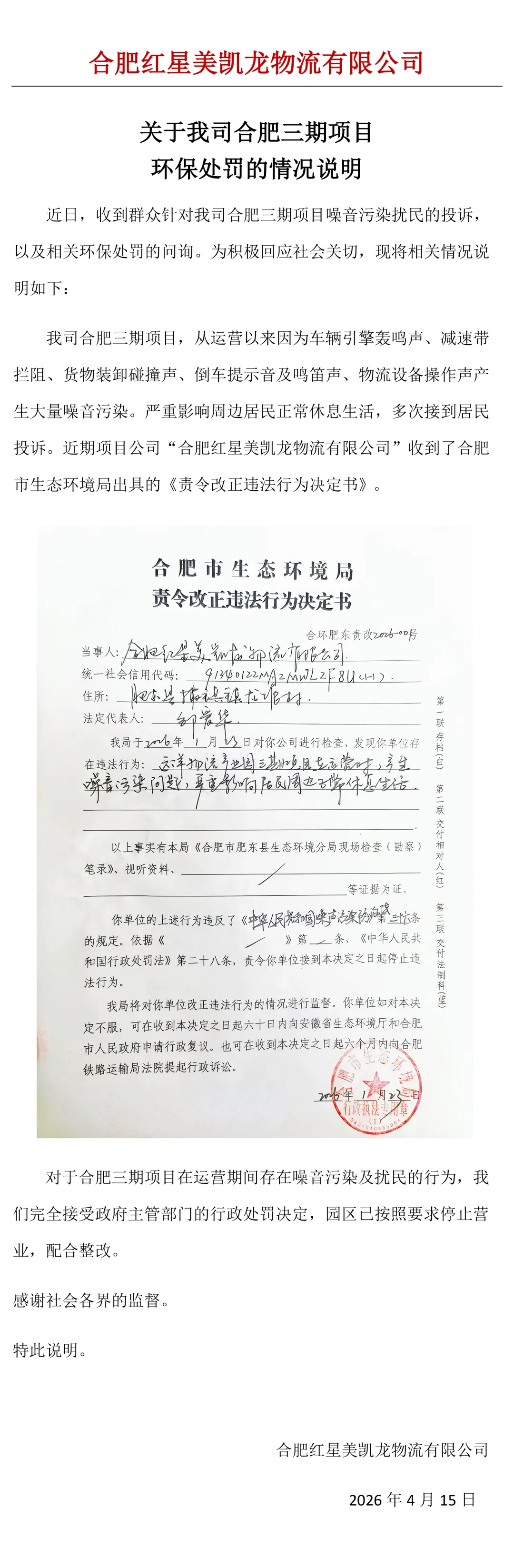 关于合肥三期项目环保处罚的情况说明