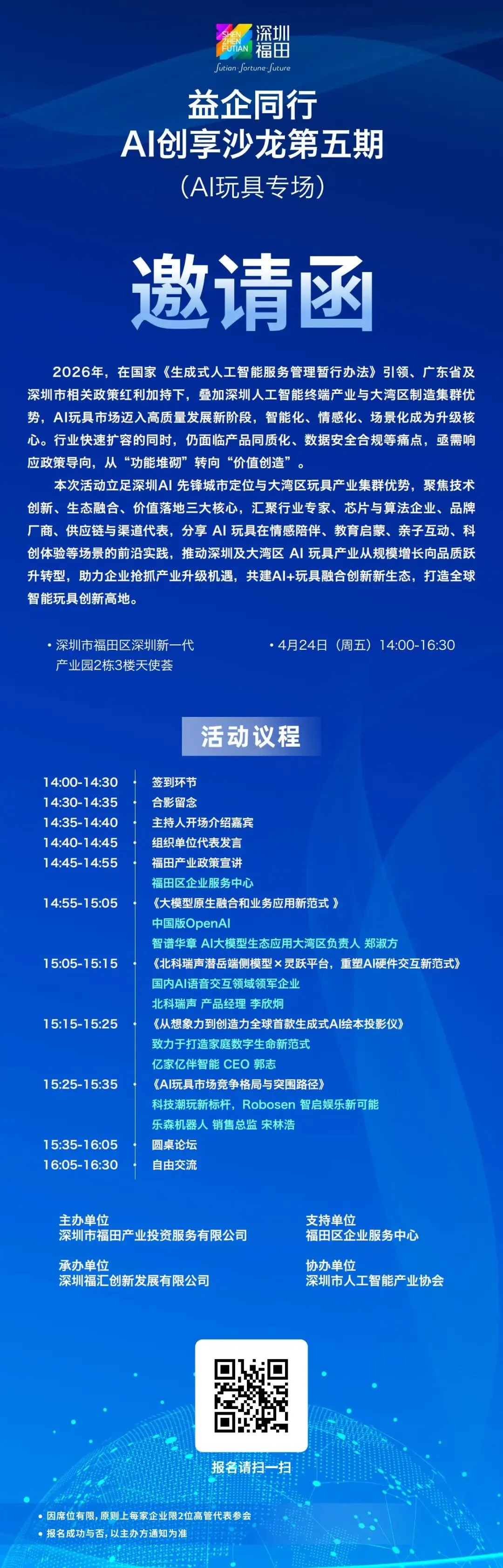 【活动预告】益企同行AI创享沙龙第五期(AI玩具专场) END —往期推荐— 联系我们 序号 负责内容 负责人及手机号 01 大会参展咨询&企业合作 唐剑铭15818569461 02 大会展团接待 王亚平15950538675 非诚勿扰,请根据实际需求咨询相关工作人员