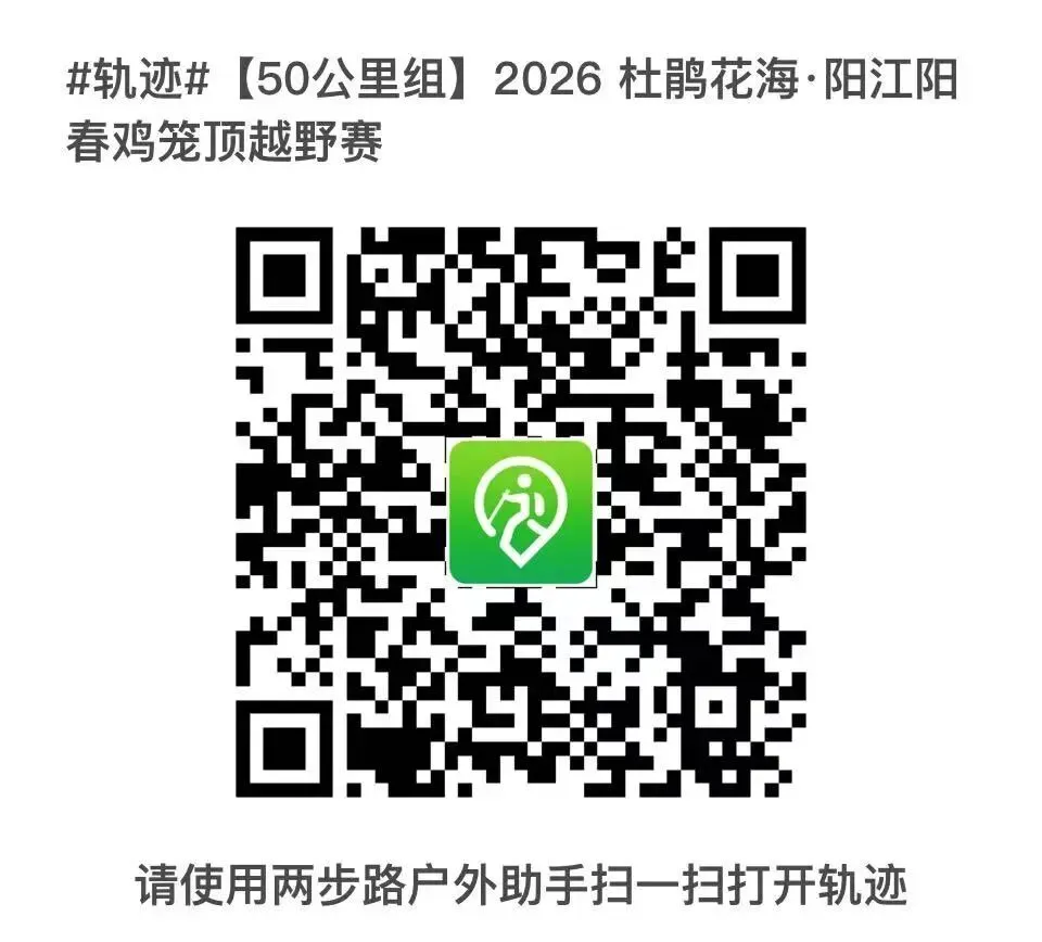 扫描下方二维码即可打开【50公里组】2026杜鹃花海·阳江阳春鸡笼顶越野赛,下载和使用「两步路·户外助手」APP,更可导出KML、GPX等轨迹文件。