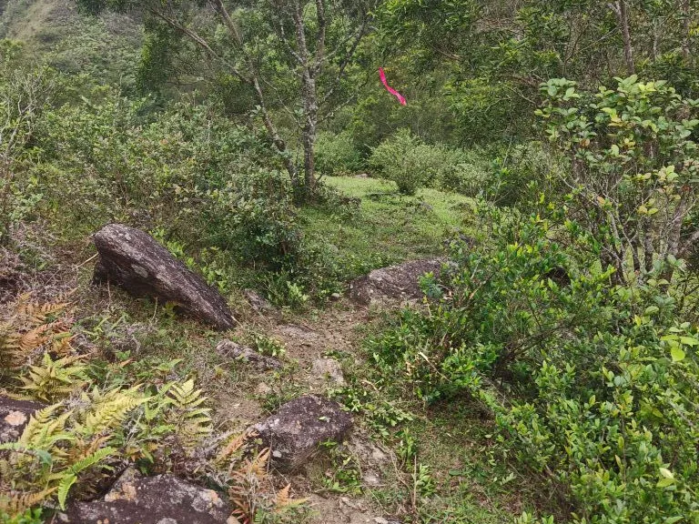 离开CP4南药基地后,又要开始缓坡进山啦,又到了一段高难度赛段,赛段不长,但爬升不小,前段以机耕路为主,两边景色不错。去年通过较窄的地方,今年我们加宽了赛道,让大家更好通行。沿着水渠道前行,穿过一片竹林,踩着满地的花瓣进入我们的秘密花园,这里有漫山遍野的杜鹃花,顺着丛林小道沿着路标前行,开始要征服双石顶啦。当你踏上山坳远眺,天气好的时候连绵的山峦尽收眼底,扭头向右看,十二楞顶还在等着我们去挑战。都跑到这里了,深吸一口气,盘它,沿着羊肠小道,踏着绿油油的草甸直奔山顶,CP5就在山坳里,可乐,热粥,美食啥都有。如果下午此路段会起雾,浓见度较低,请跟着路标走,抵达千年杜鹃林后,祝贺你已经基本上完成了爬升赛段。