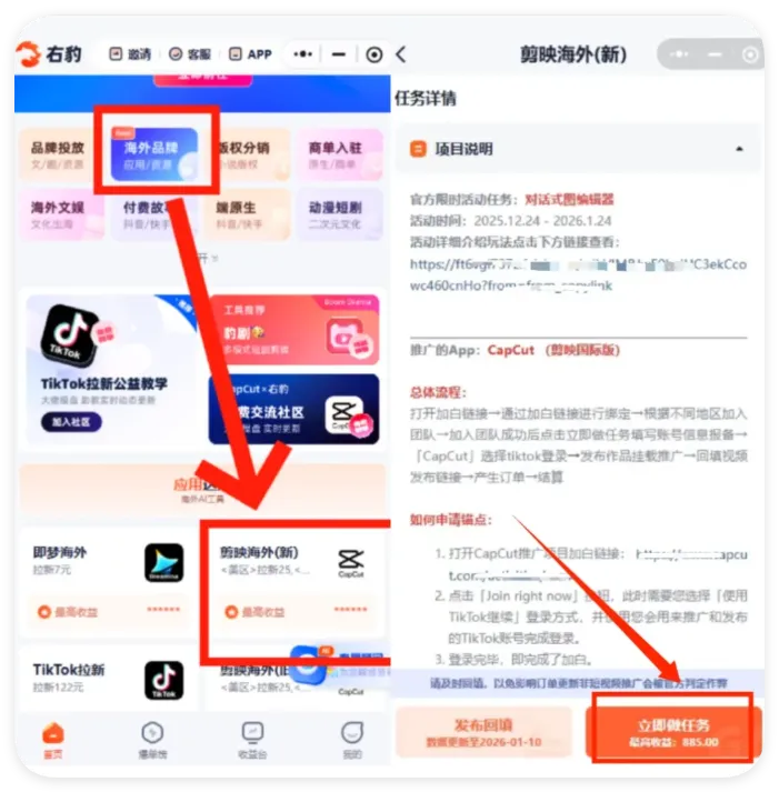 打开右豹小程序 ( 邀请码378791 ) ,点击海外品牌-剪映海外进入任务界面-详细任务说明-点击立即做任务申请即可,通过后就能发视频推广了。