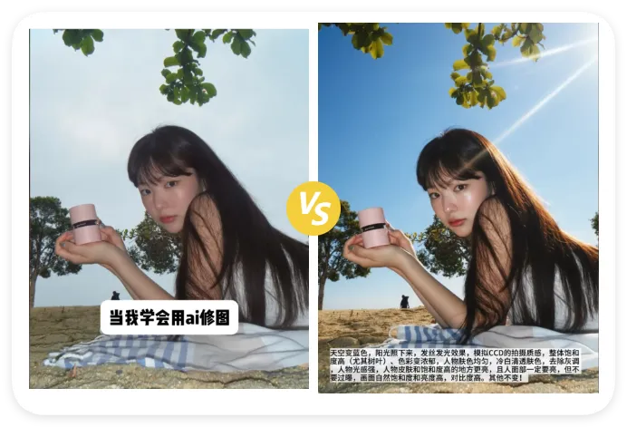 可以直接搬运最近流行的滤镜/拍摄风格,将AI指令直接加在图片上,并加上前后对比图。