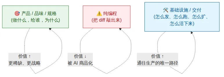 如果上面的论证成立,那给个人的职业建议就相当具体,而且不那么讨喜。”学 Prompt”不是答案,”用 AI 写代码写得更快”也不是答案。答案是:刻意投资那些让你成为”从 Agent 的 diff 到用户屏幕”这条路径所有者的技能。