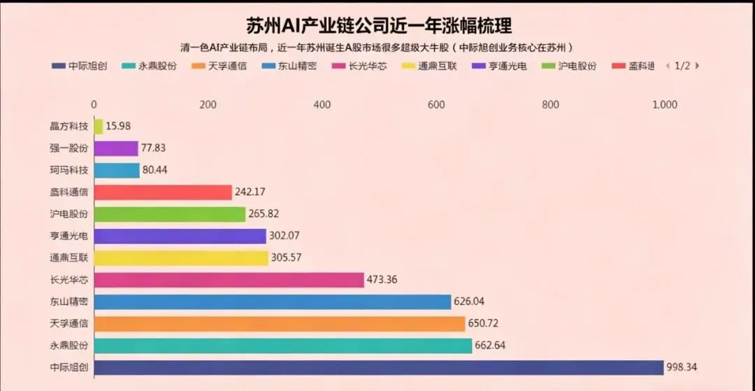 晚上苏州板块诞生的超级大牛股榜单刷爆自媒体,12家顶流AI牛股,11家总部在苏州,苏州直接变成了AI牛股天团聚集地。凭借着深厚的制造业基础,苏州很早就完成了完整的AI硬件产业链布局,孕育了一批在细分领域领跑的企业,刚好又踩中了AI时代的风口,最终迎来了产业大爆发